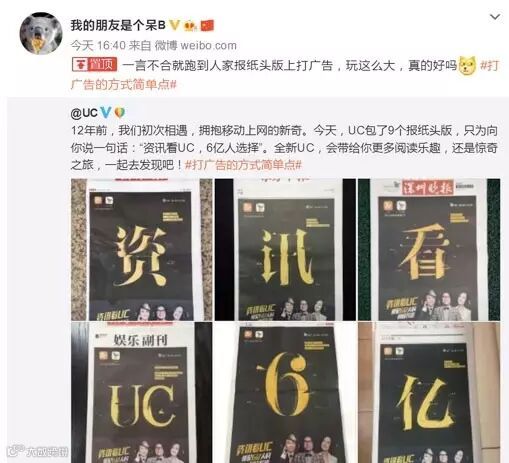 再看UC这一次,利用九家重量级纸媒集体发声,且表达内容如此“简单粗暴”,这一做法在之前的诸多广告案例中就略显“出格”。其实UC此举与目前的创意市场现状不无关系,当受众对创意的要求,和吸睛的投入成本都越来越高,抛弃套路来点简单的,也未必不是好事。