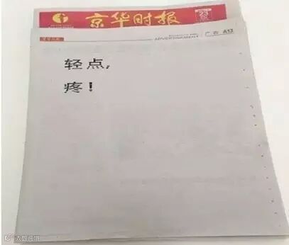 如《北京青年报》的烈焰红唇、《京华时报》的"轻点,疼!"、《深圳晚报》的致李女士等。今年6月,《京华时报》还连续打出3个生僻字,引发猜想不断,不过很多“久经沙场”的网友已经猜到是方太新品发布会的广告。
