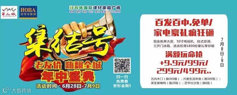 好百年家居年中盛典:百万豪礼疯狂砸(百发百中),九块九超值换购,0元领电影票……嗨翻全城!