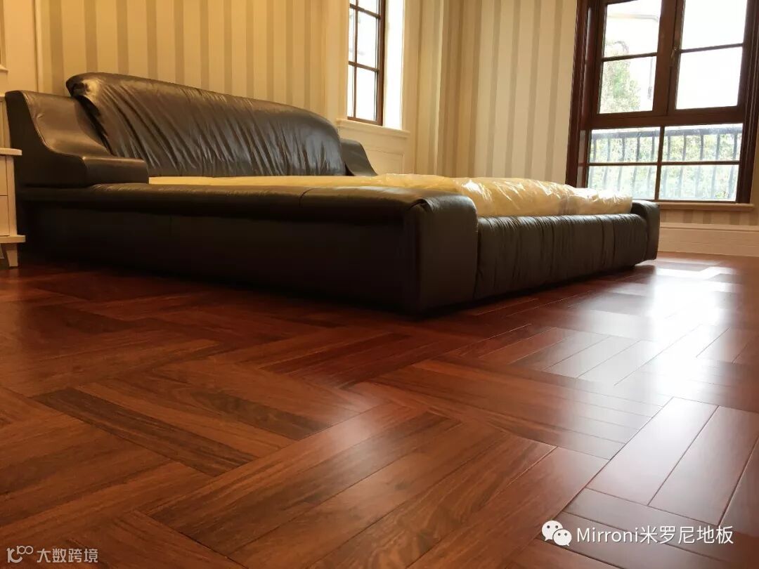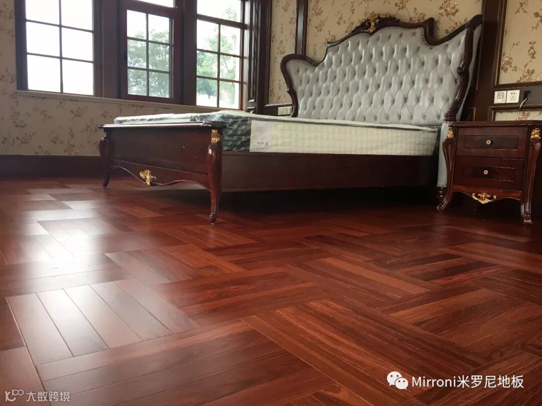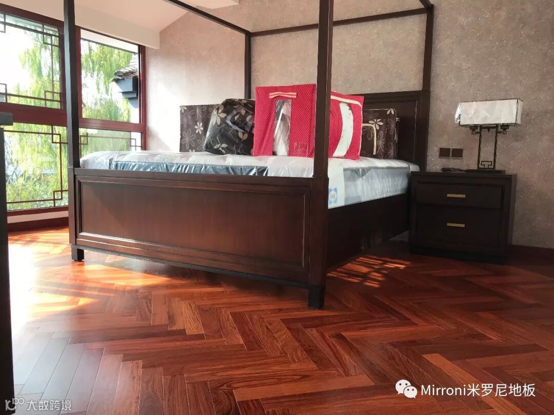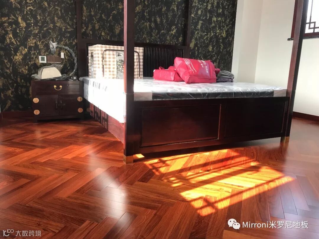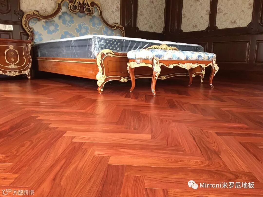 mirroni米罗尼亚花梨地板,经典人字拼的各种风格搭配,无论欧式、法式、美式、中式、还是新中式,都十分出彩。她的稳定的材质以及靓丽的纹理,都具有中国特有的元素,使家居生活环境,温馨、富贵、靓丽、典雅。