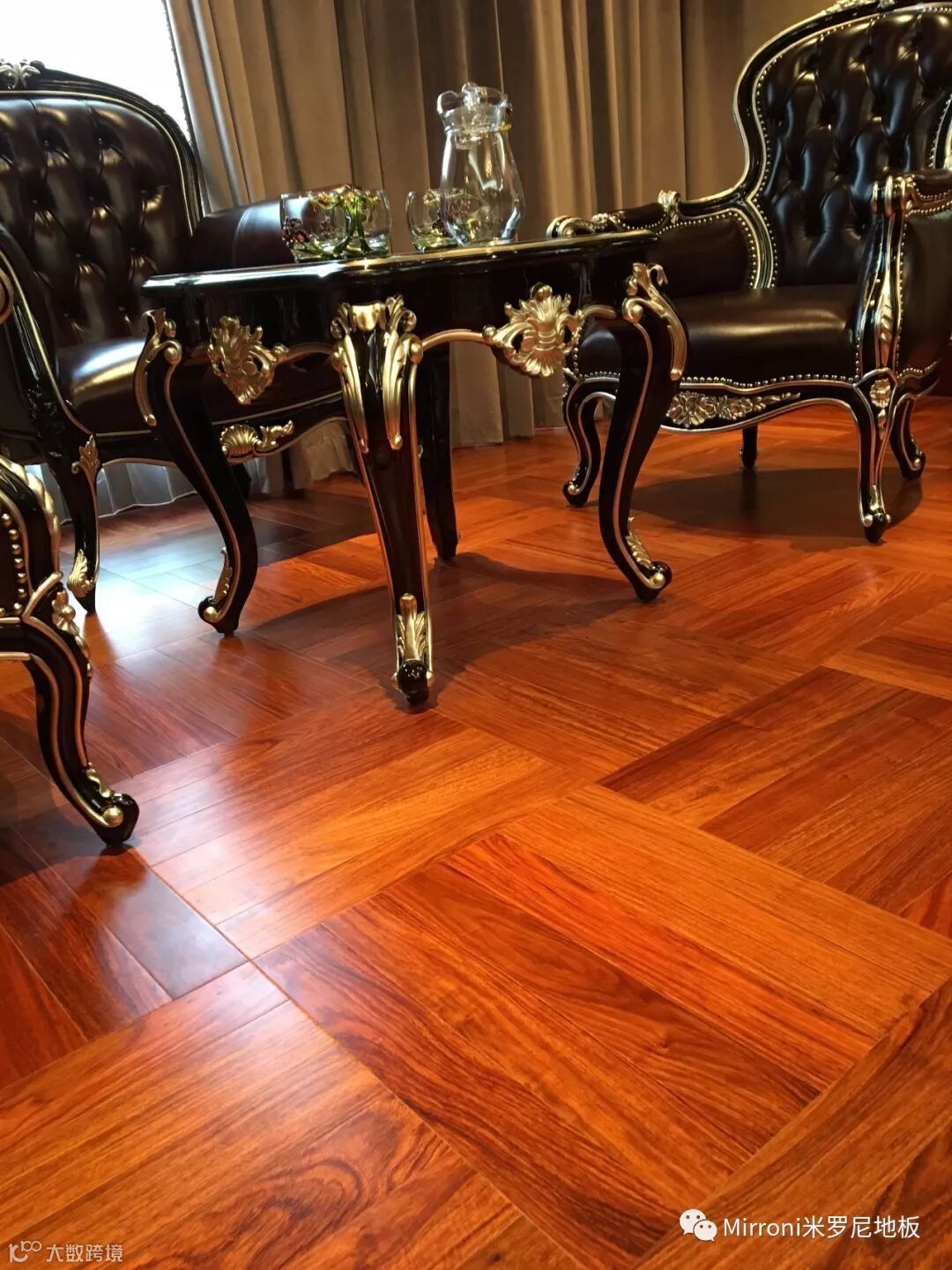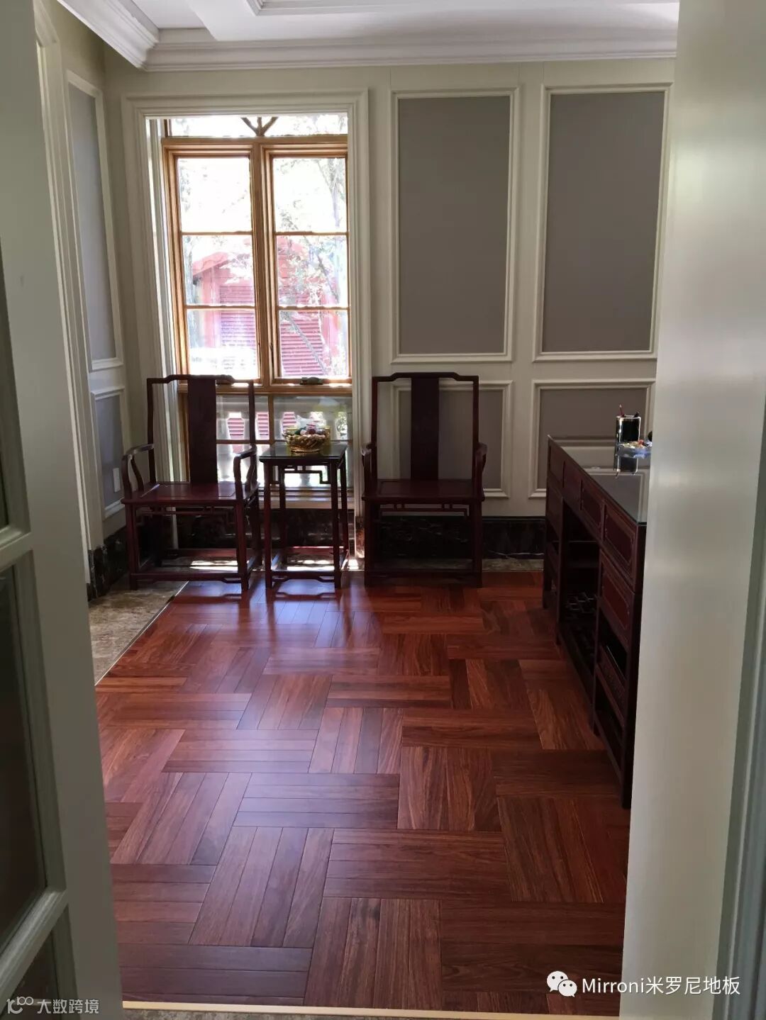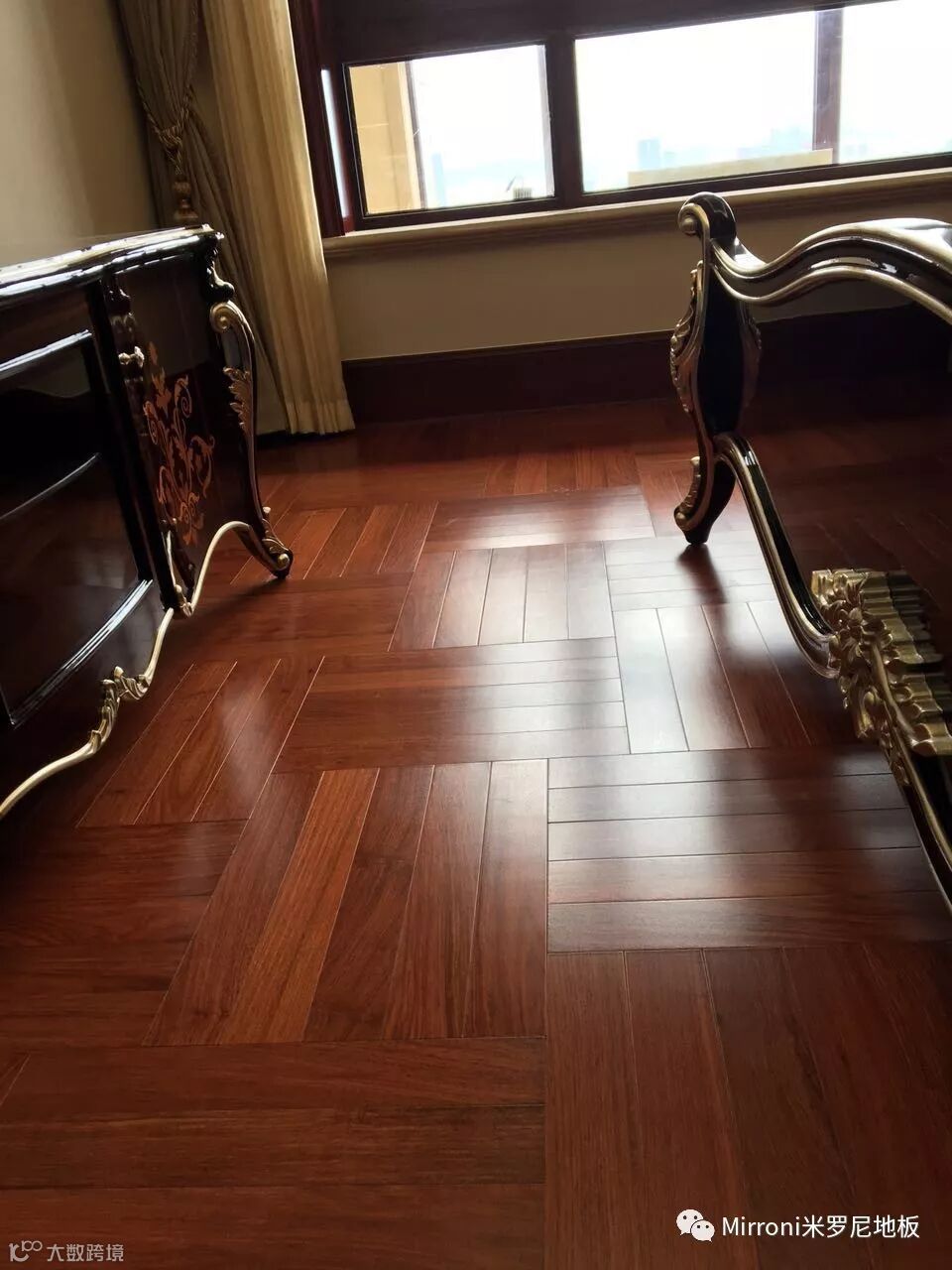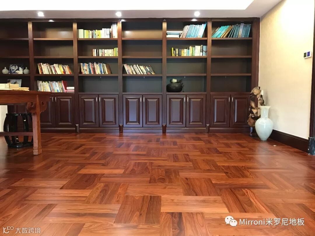 mirroni米罗尼亚花梨地板,经典人字拼的各种风格搭配,无论欧式、法式、美式、中式、还是新中式,都十分出彩。她的稳定的材质以及靓丽的纹理,都具有中国特有的元素,使家居生活环境,温馨、富贵、靓丽、典雅。