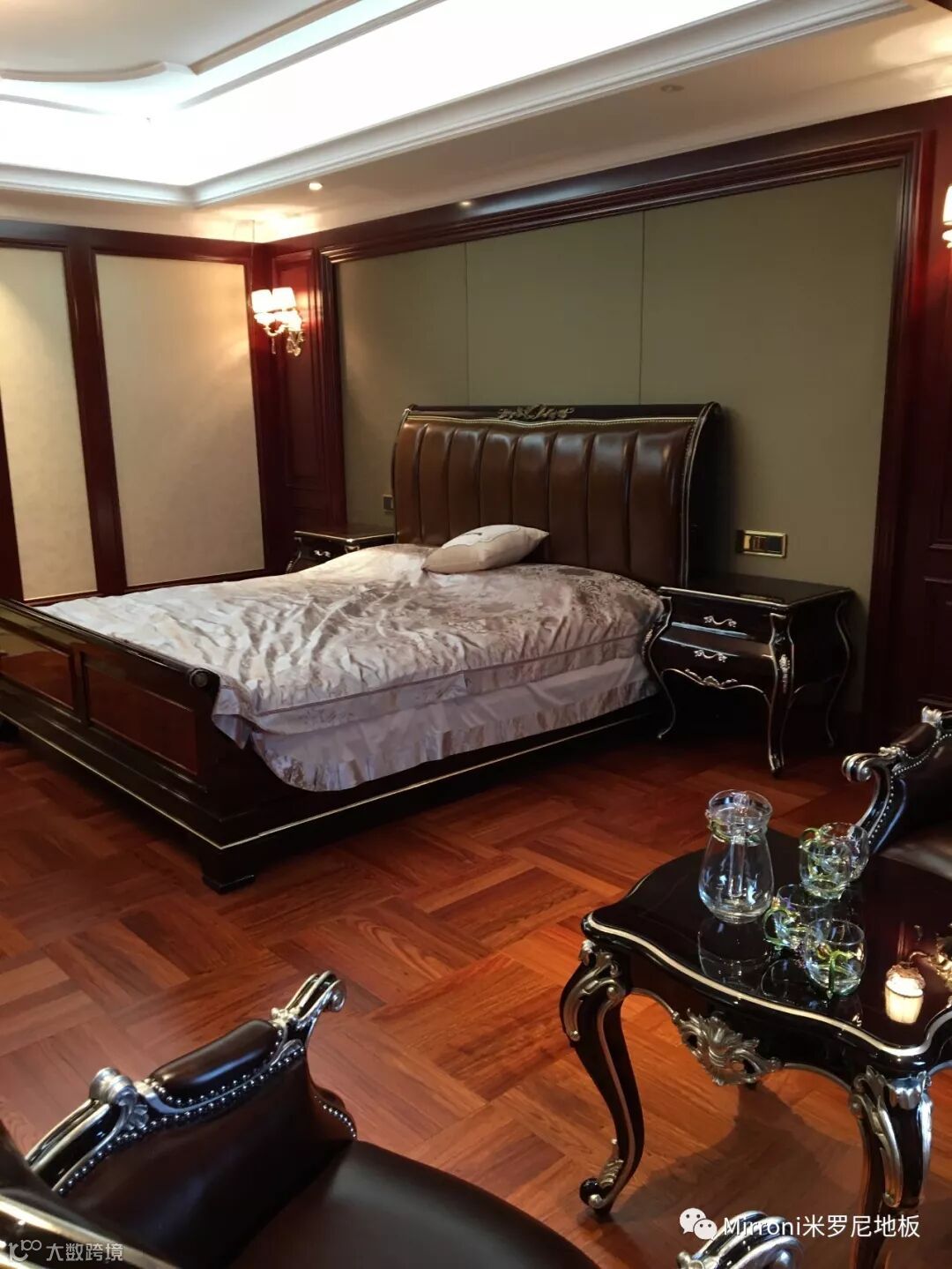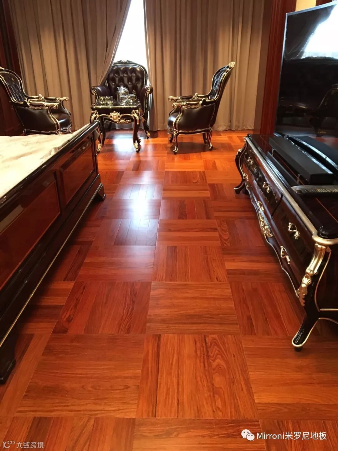 亚花梨的正方形拼法,也是一款比较稳重又不失时尚的铺设方法。配上黑色高贵的家具,是整个家居流光溢彩、相得益彰。