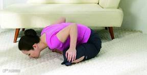 3.屏息数秒,慢慢吐气将上半身回正。从第1个动作开始做,一式做8次。