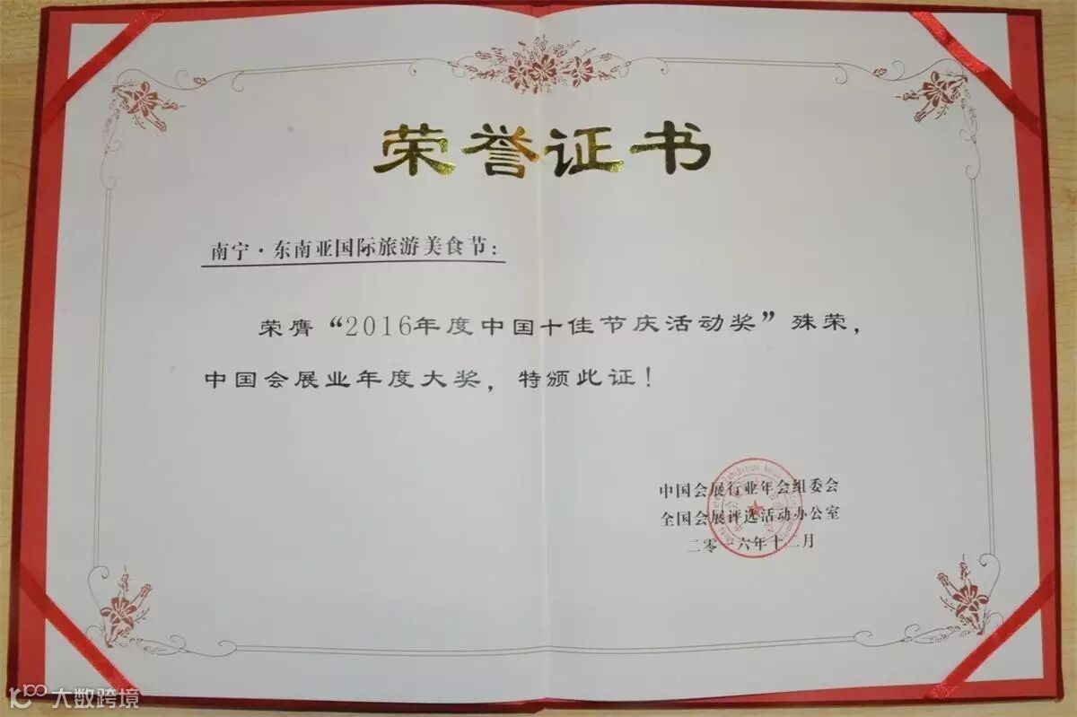 12月14日,在中国会展行业年会组委会、全国会展评选活动办公室主办的节庆评选活动中,由南宁华南城主办的“南宁·东南亚国际旅游美食节”荣膺“2016年度中国十佳节庆活动”和“中国会展业年度大奖”殊荣。