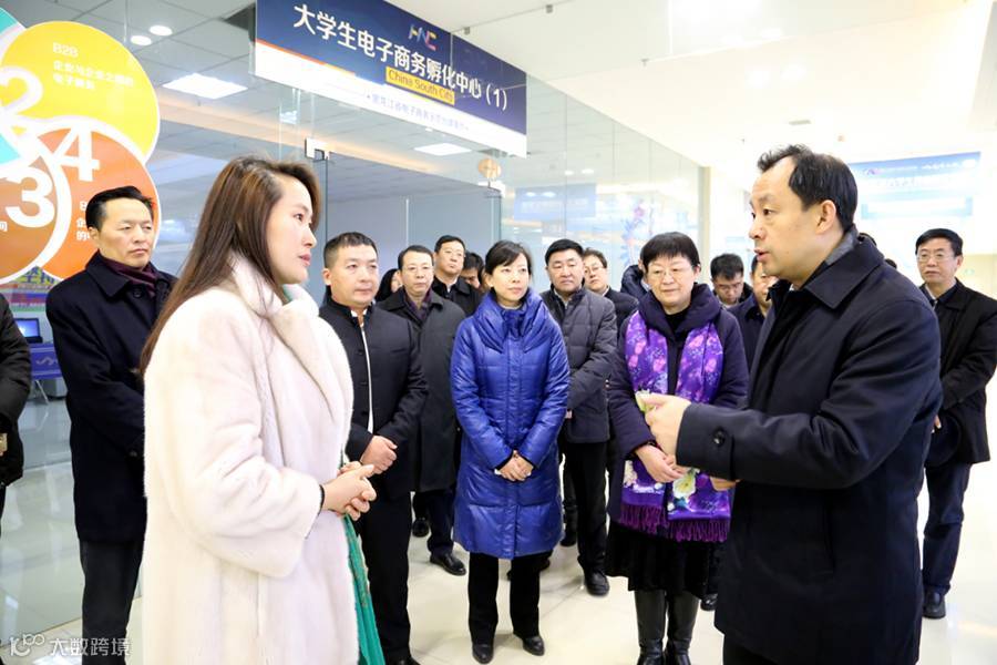 ▲哈尔滨华南城常务副总经理许洪霞(左一)向黑龙江省委副书记、省长陆昊(右一)介绍大学生创业孵化基地及电商基地情况