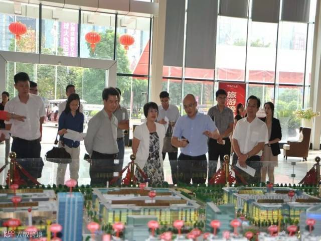 ▲ 南宁华南城总经理王培武(右二)向南宁市副市长伍娟(右三)详细讲解南宁华南城的建设情况及发展规划