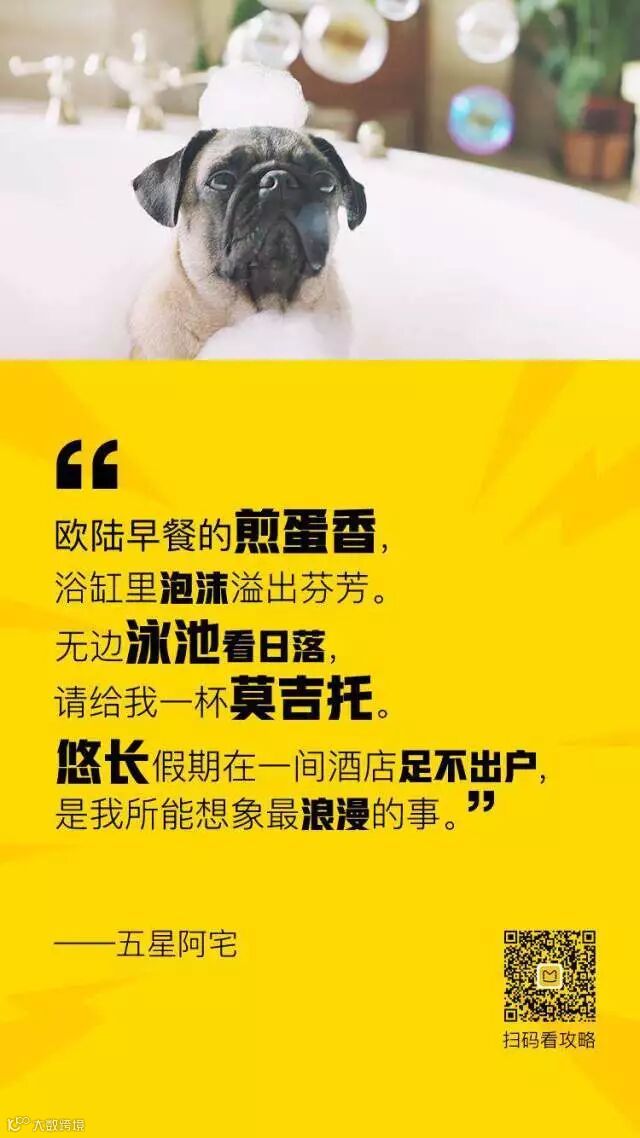 五星阿宅与巴哥犬:酒店爱好者,五星级酒店控,精品酒店爱好者,出门旅游宁可宅在酒店也不出门的,可以泡在酒店泡一天的。