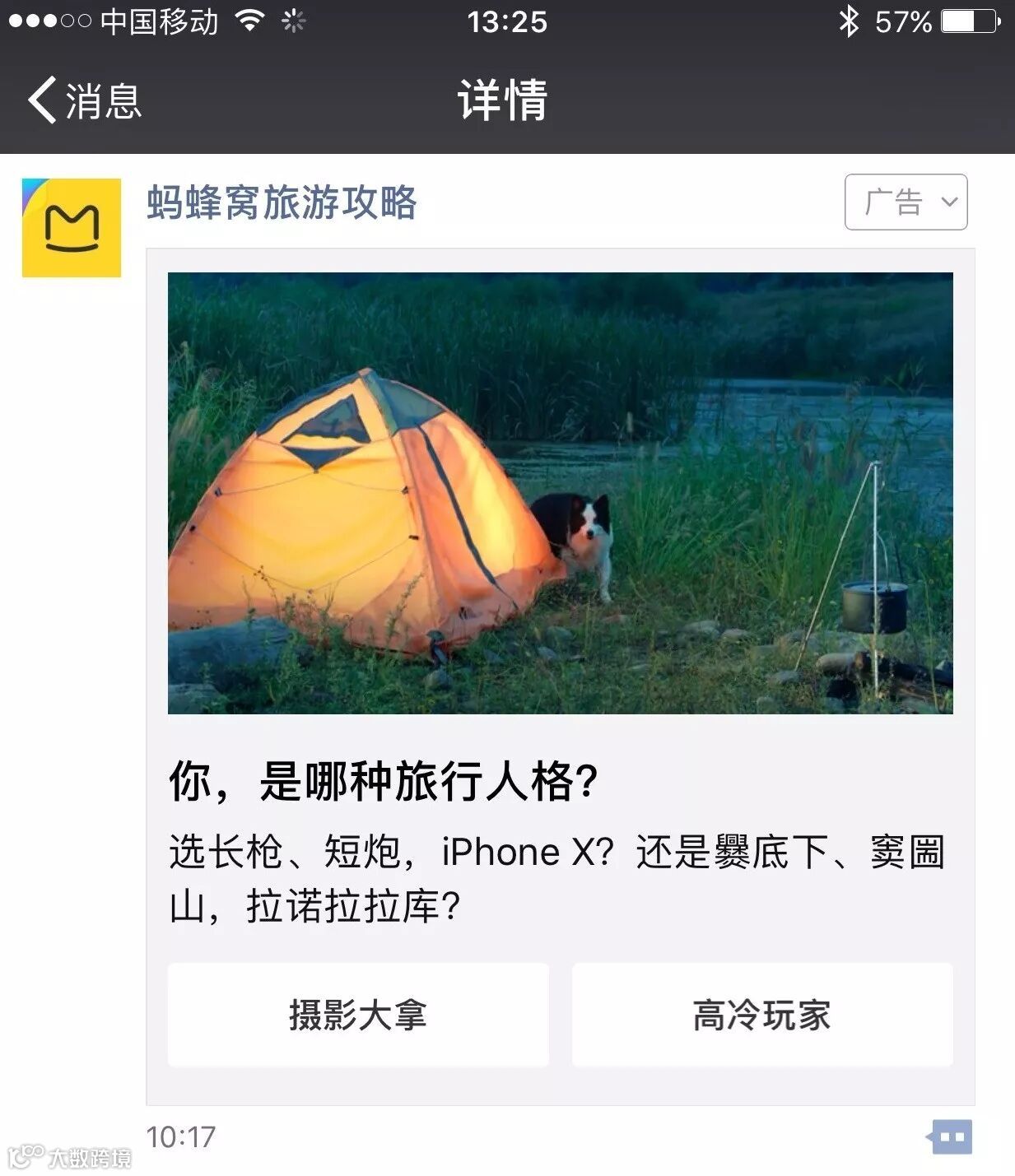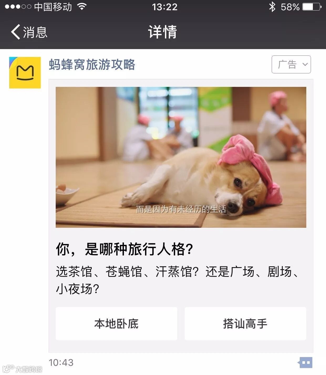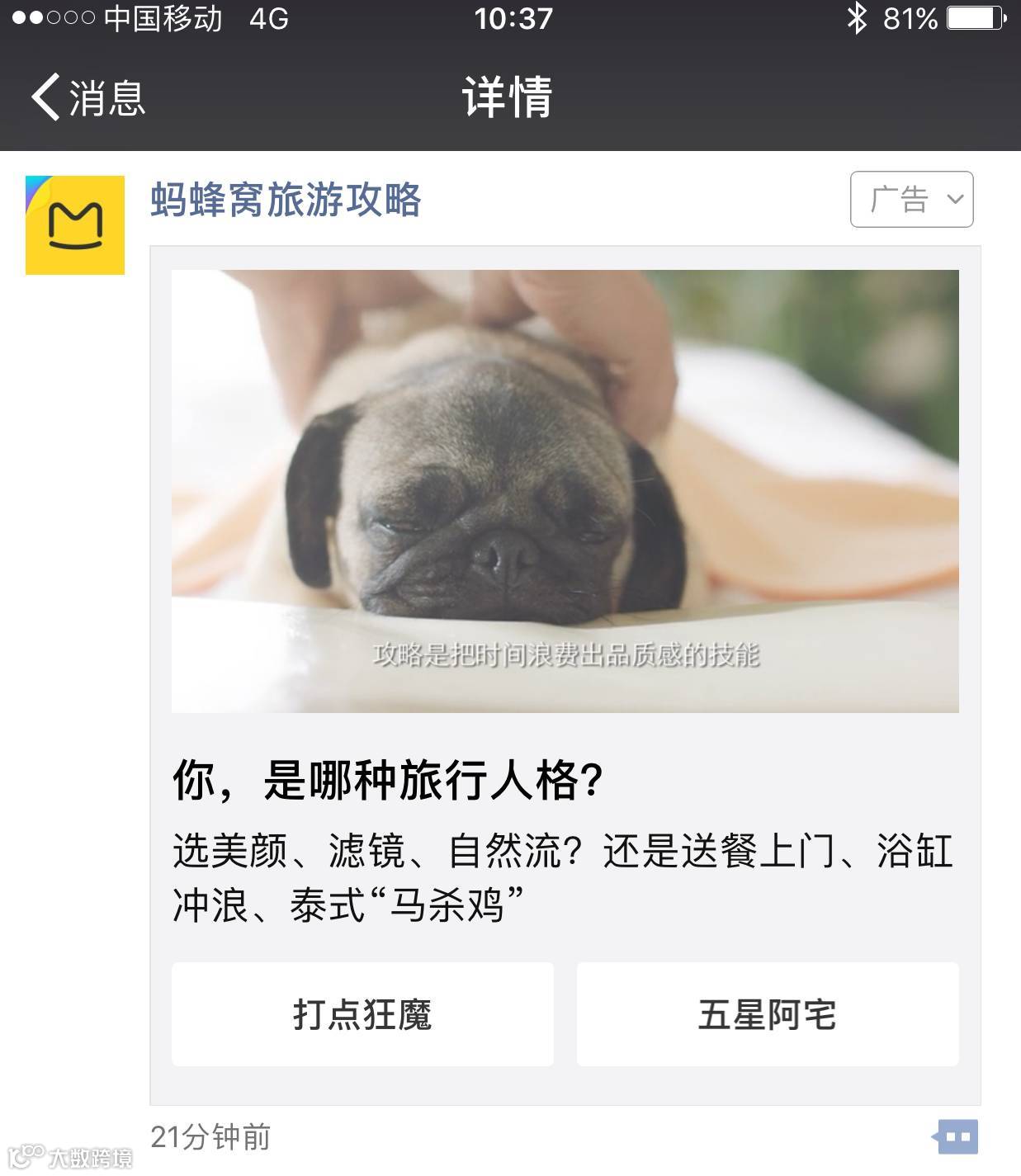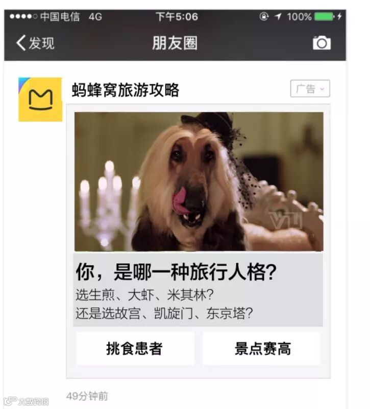 为向不同旅行人格的族群传递自由行攻略的品牌价值,蚂蜂窝自由行为其朋友圈广告策划了一场关于“旅行人格”的心理大测试。凭借大数据的支持,他们发现热爱旅行的人,同样也是宠物爱好者。