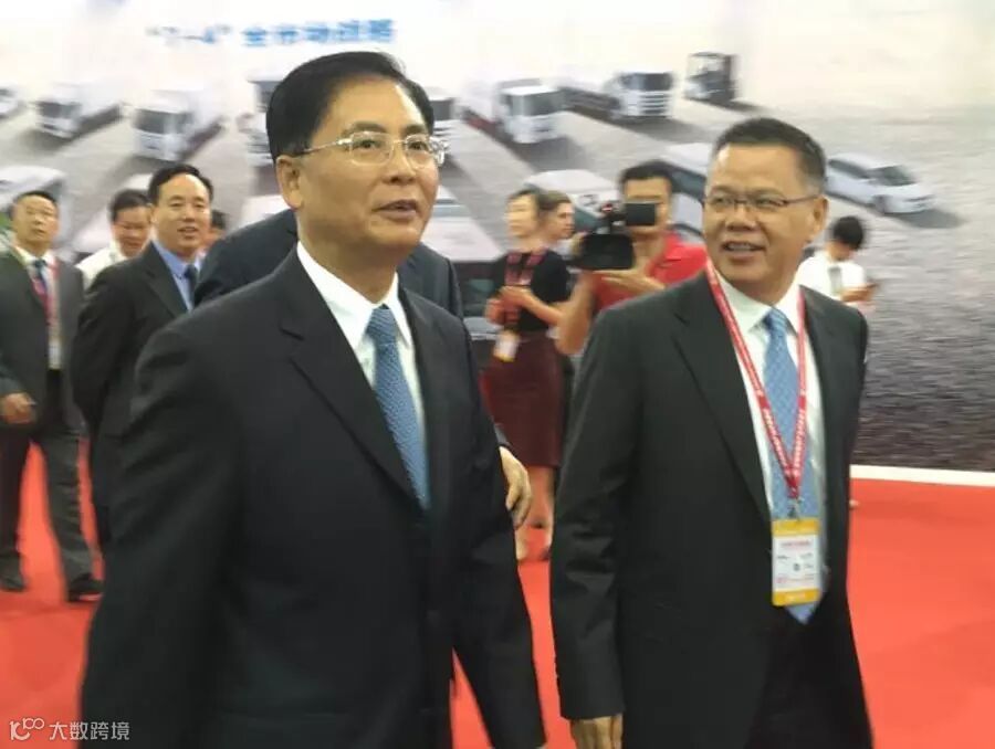 ▲深圳市委常委杨洪(左一)与华南城集团董事长郑松兴步入乾龙物流展厅