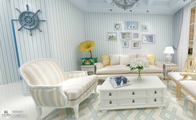 地毯不仅能够改变室内的装饰风格,还能够稳定和辅助家居风格的表现,例如蓝色地中海风格的设计中,选用了蓝白纹理的地毯,和墙上的条纹壁纸相映成趣,既填充了地面的色彩空白,又突出了家居风格的主题。