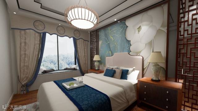 装饰画的选择既要考虑风格相匹配,也要注重色彩搭配,最好的装饰画,通常会和室内其他家具、饰品的颜色有一定重叠,或者花纹近似。例如,这个中式风格的卧室,选用了一幅和床品、窗帘颜色一致的壁画,淡雅高贵之感顿时显现出来。