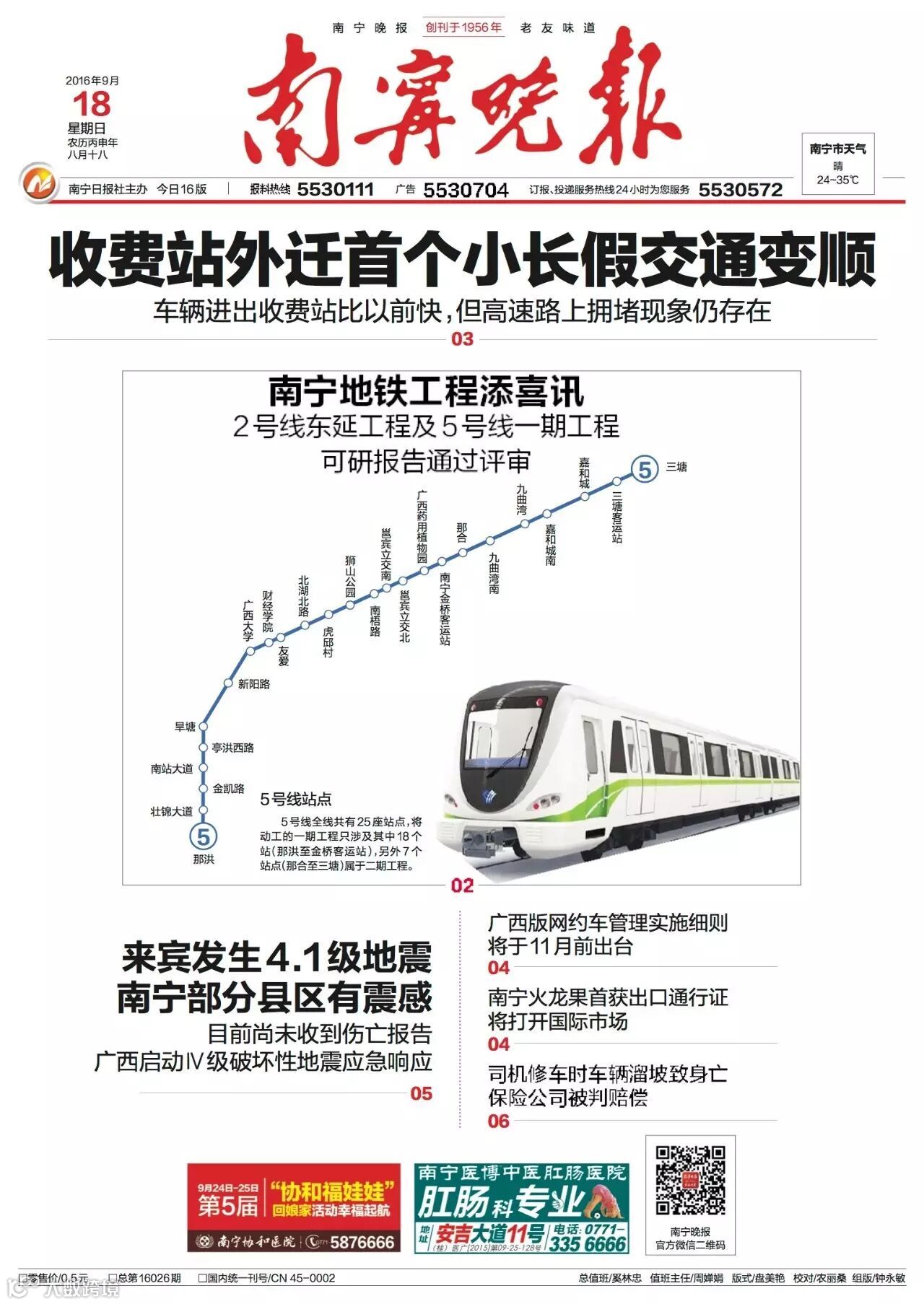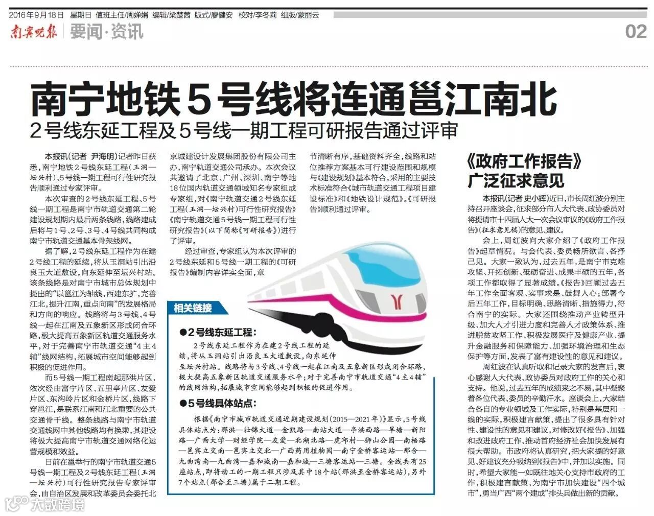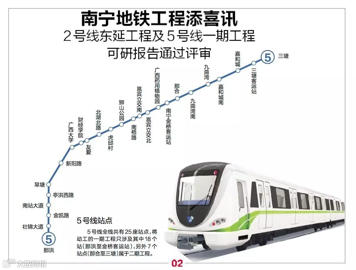 (南宁晚报讯 记者 尹海明)记者昨日获悉,南宁地铁2号线东延工程(玉洞—坛兴村)、5号线一期工程可行性研究报告顺利通过专家评审。