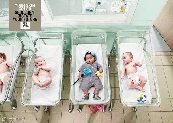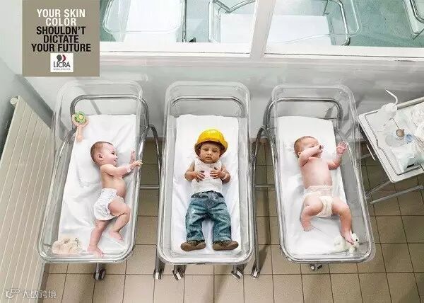 “你的肤色不该决定你的命运”,来自法国的Licra公益广告,倡导人们不要用歧视的眼光对待有色人种,广告中给这些有色人种的婴儿套上工作服,与旁边的白人婴儿形成强烈的反差,其用意无需多言。