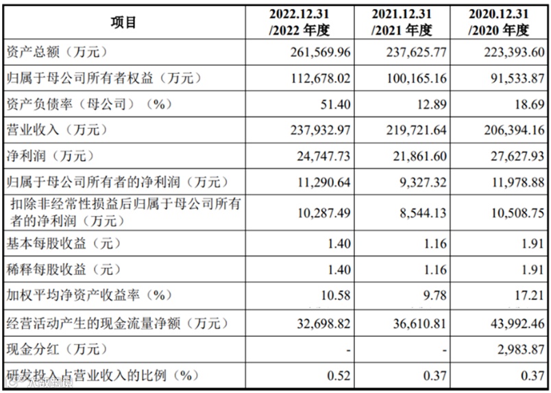 2020年至2022年,公司营业收入分别为20.64亿元、21.97亿元、23.79亿元;归母净利润分别为2.76亿元、2.19亿元和2.47亿元。