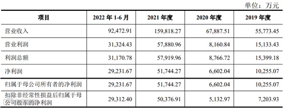 2019年度、2020年度、2021年度和2022年1-6月,公司营业收入分别为55,773.45万元、67,887.51万元、159,818.27万元和92,472.91万元,实现的净利润分别为10,255.07万元、6,602.04万元、51,744.27万元和29,231.67万元。