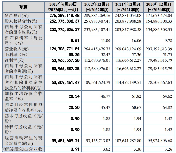 2020年至2023年上半年,公司营业收入分别为2.07亿元、2.69亿元、2.64亿元、1.27亿元;归母净利润分别为7,948.50万元、11,660.66万元、11,268.10万元、5,396.56万元。