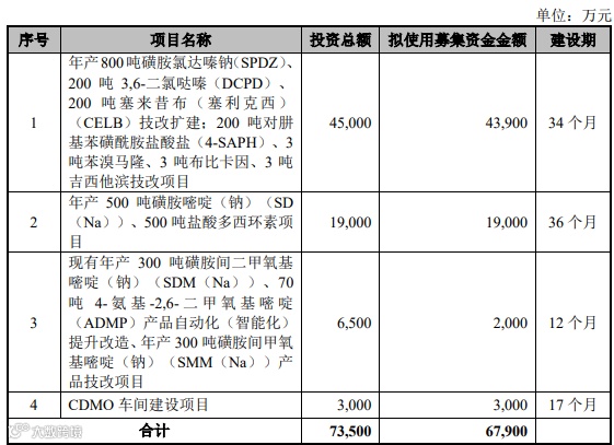本次发行前公司总股本为60,000,000股,海昇药业拟公开发行数量不超过2,000万股(未考虑超额配售选择权的情况下),占发行后公司总股本的比例不低于25%。预计募集资金6.79亿元,用于年产800吨磺胺氯达嗪钠(SPDZ)、200吨3,6-二氯哒嗪(DCPD)等项目。