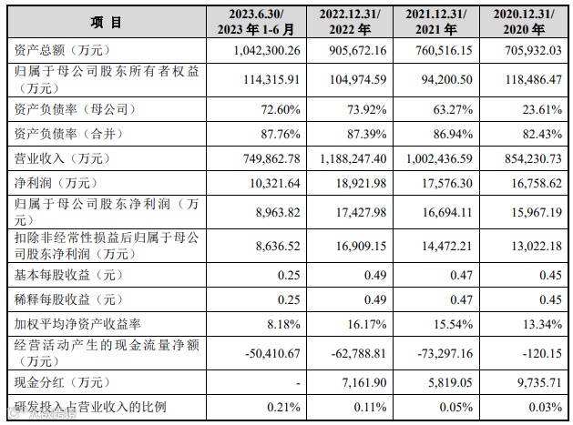 2020年至2023年上半年,公司营业收入分别为85.42亿元、100.24亿元、118.82亿元、74.99亿元;归母净利润分别为1.60亿元、1.67亿元、1.74亿元、8,963.82万元。