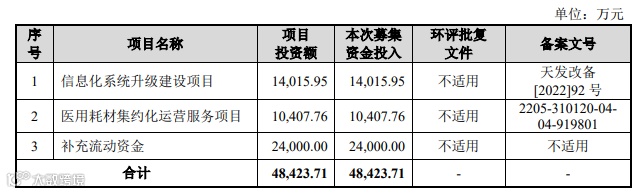 公司本次发行前总股本为35,809.5232万股,建发致新拟公开发行不超过6,319.3277万股,且发行数量占公司发行后总股本的比例不低于15%。预计募集资金4.84亿元,用于信息化系统升级建设项目、医用耗材集约化运营服务项目以及补充流动资金。