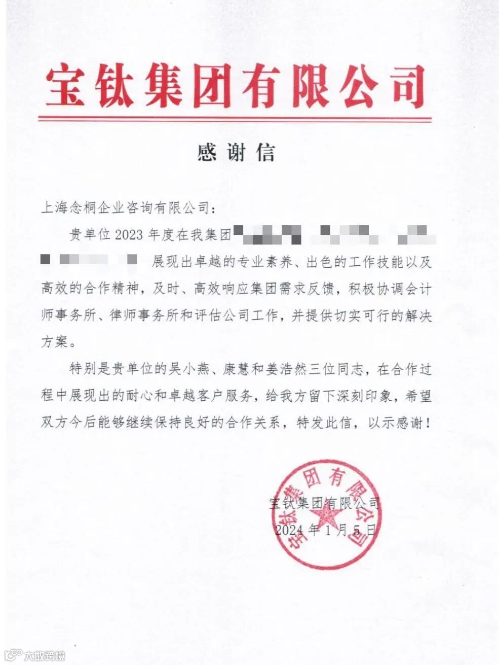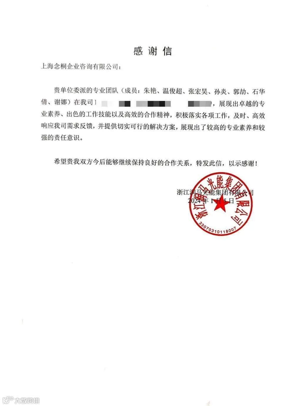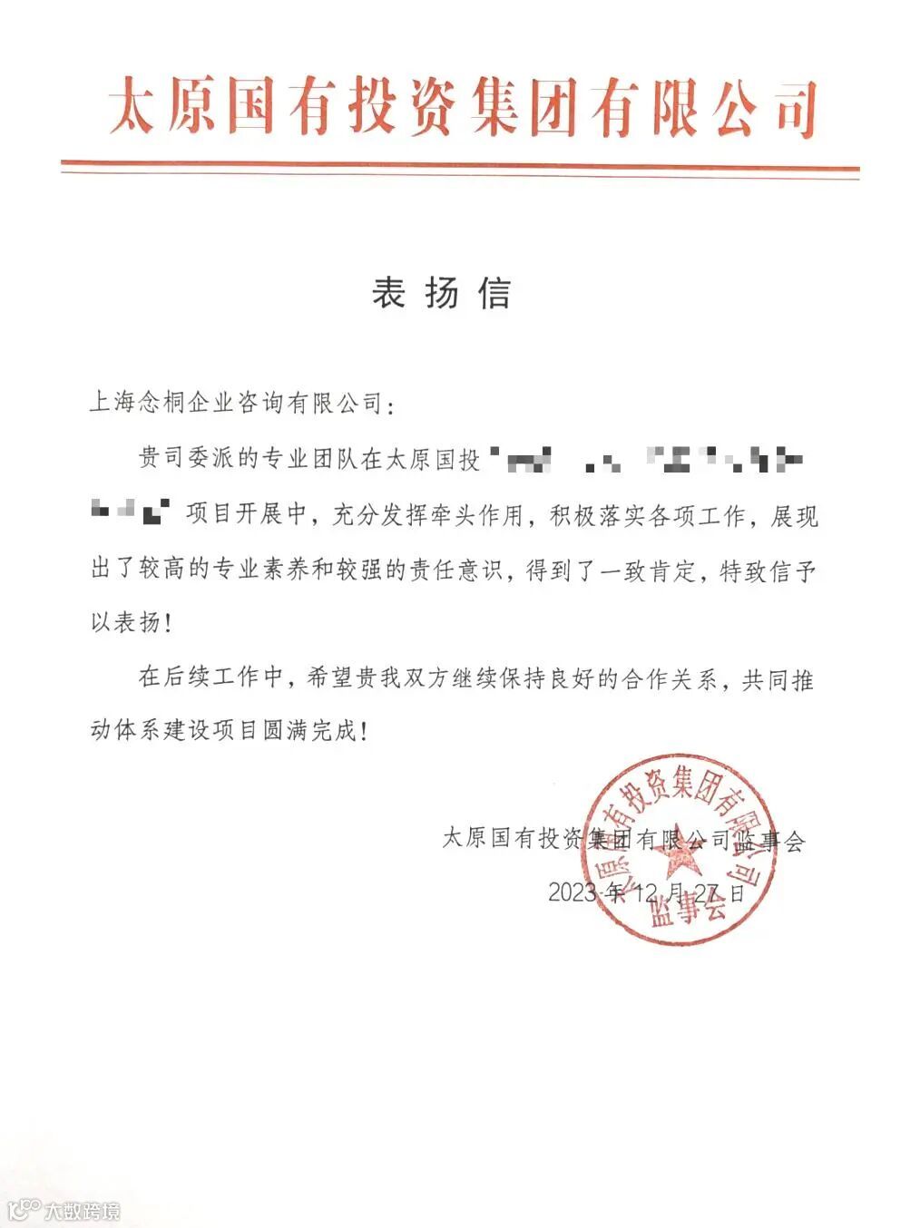 连日来,念桐咨询业务团队在工作方面的突出表现,收到了各位客户的大力认可,一封封感谢信、表扬信纷至沓来。字里行间是对我们的充分信赖与认可,代表着荣誉,更意味着责任,