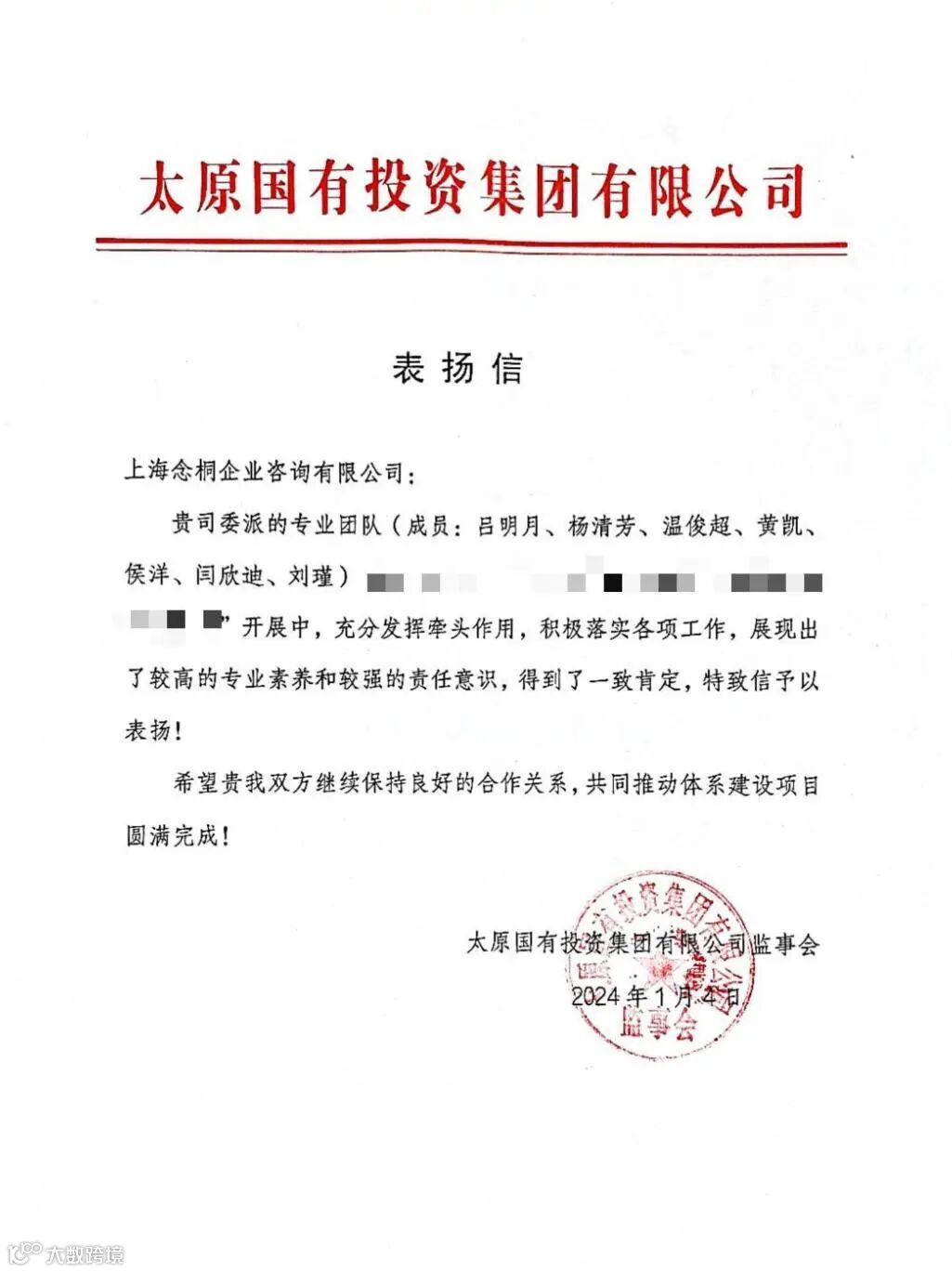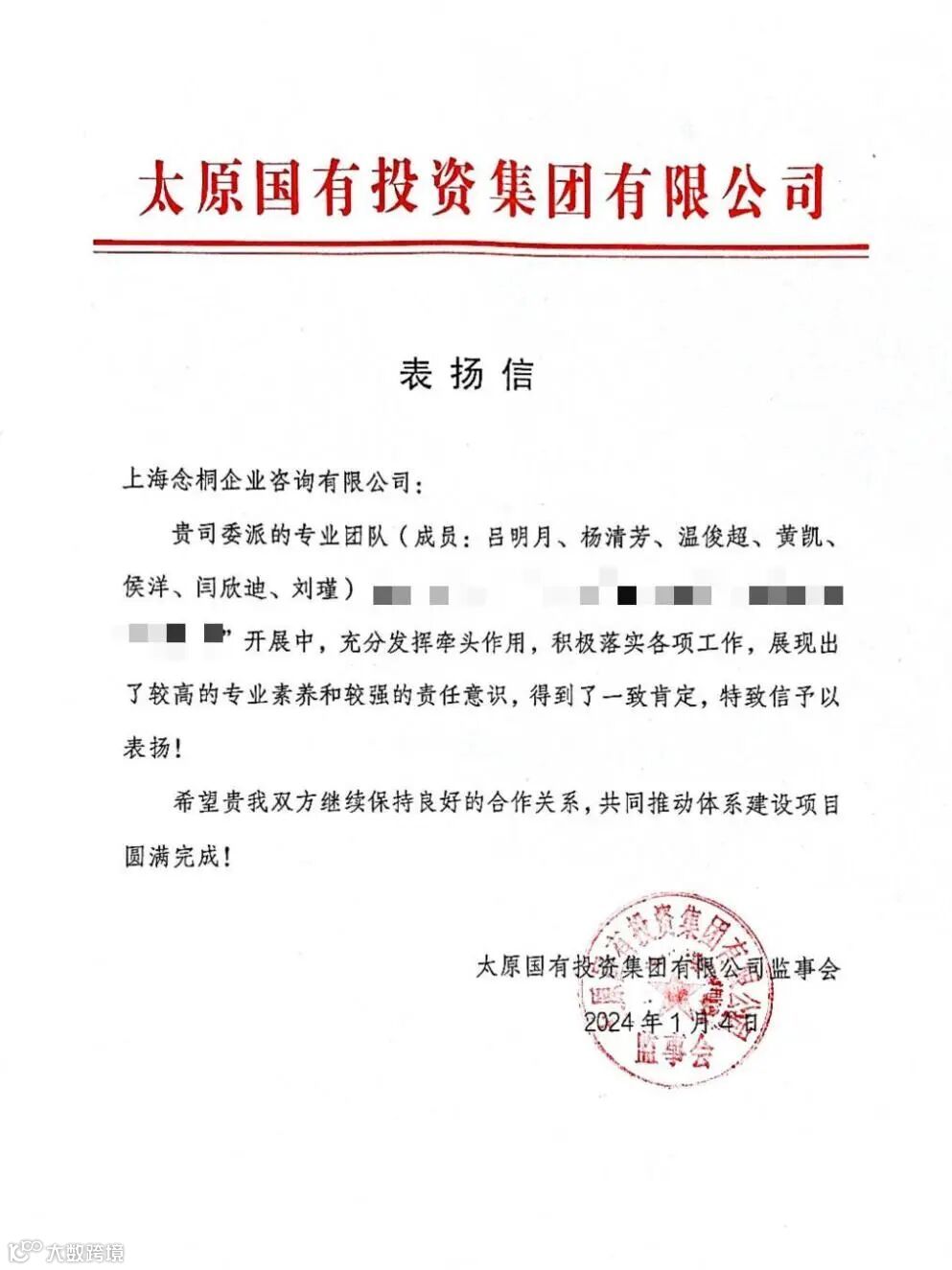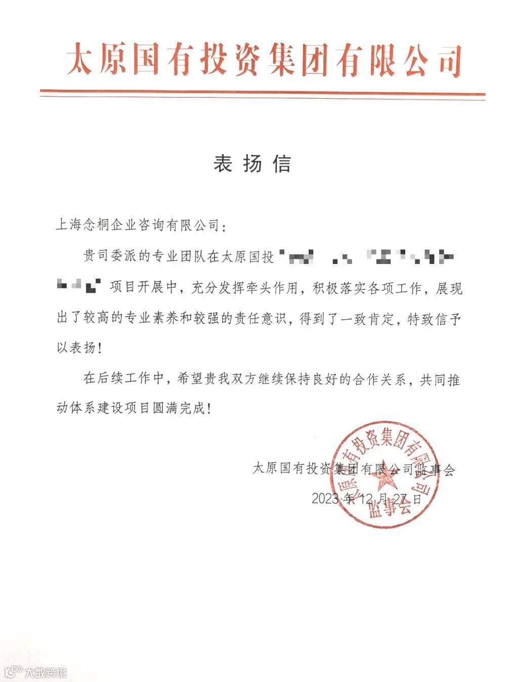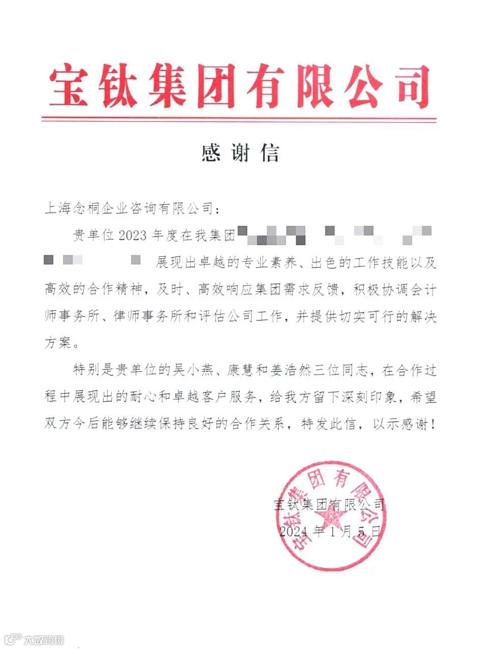 连日来,念桐咨询业务团队在工作方面的突出表现,收到了各位客户的大力认可,一封封感谢信、表扬信纷至沓来。字里行间是对我们的充分信赖与认可,代表着荣誉,更意味着责任,