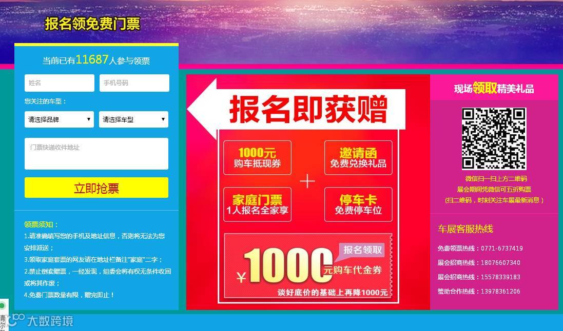 2.领取车展交强险 2888份价值1000元购车代金券通过免费门票随机夹送,凭券车展底价基础上可再优惠1000元。