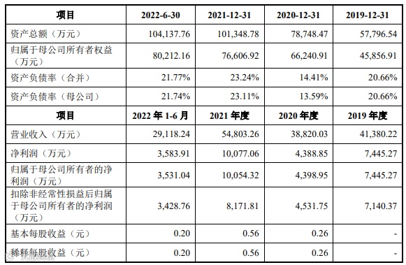 2019年至2022年1-6月,公司营业收入分别为4.14亿元、3.88亿元、5.48亿元和2.91亿元;净利润分别为7,445.27万元、4,388.85万元、10,077.06万元、3,583.91万元。