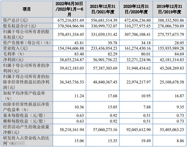 2019年至2022年1-6月,公司营业收入分别为1.56亿元、1.61亿元、2.33亿元和1.54亿元,归母净利润分别为4,526.8万元、3,194.8万元、5,738.7万元、3,941.2万元。
