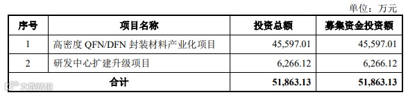 此次IPO拟募集5.19亿元,用于高密度QFN/DFN封装材料产业化项目和研发中心扩建升级项目。