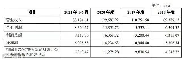 2018年-2021年1-6月,公司营业收入分别为8.94亿元、11.08亿元、12.97亿元和8.82亿元,净利润分别为5,306.54万元、10,944.40万元、14,234.63万元及6,905.58万元。