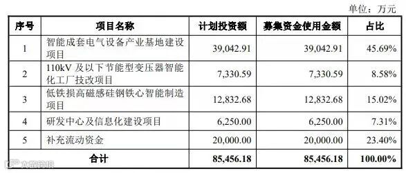 此次IPO拟募资8.55亿元,用于智能成套电气设备产业基地建设项目、110kV及以下节能型变压器智能化工厂技改项目、低铁损高磁感硅钢铁心智能制造项目、研发中心及信息化建设项目及补充流动资金。