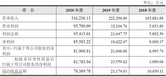 2019年-2021年,公司营业收入分别为16.59亿元、22.23亿元、31.63亿元,净利润分别为9009.37万元、18622.67万元、85583.22万元。