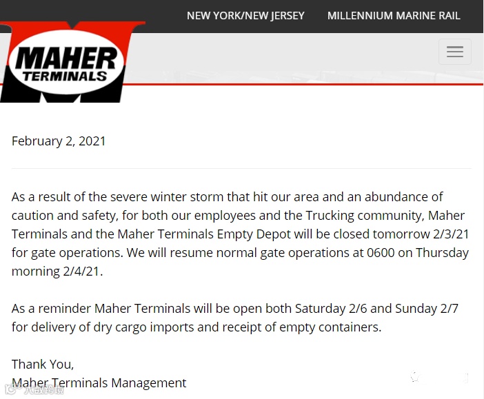 据纽约港和新泽西州最大的集装箱Maher码头(Maher terminal)发布的公告称,由于严重的冬季风暴袭击,码头和码头的空仓库将于2月3日停止运营。此外,将于2月4日星期四早上6时恢复闸口的正常操作。