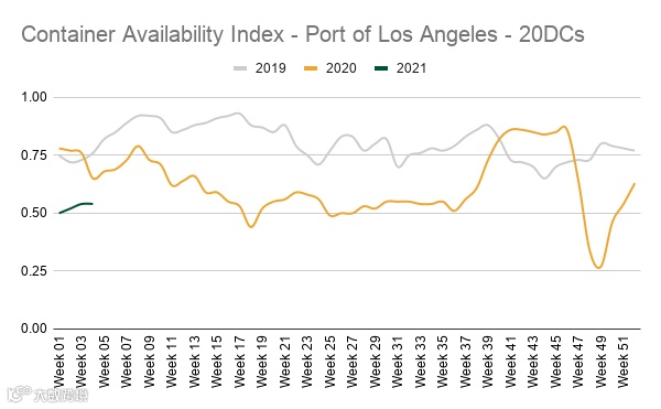 然而,随着航运公司积极地将设备重新转运到亚洲,到第49周时,洛杉矶港20英尺集装箱的可用指数降至0.27,40英尺集装箱可用指数降至0.29。