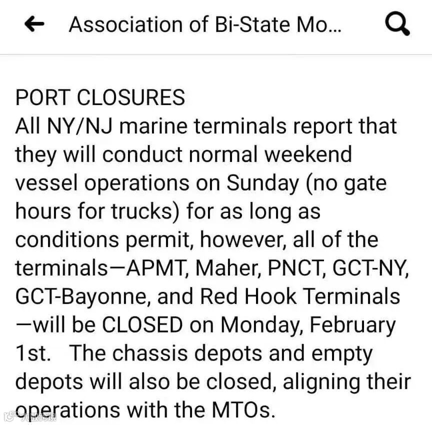 海运码头报告称,只要条件允许,将在周日进行正常的船舶操作,但卡车不允许入港,目前纽约所有的码头在2月1日周一关闭,包括APMT, Maher,PNCT, GCT-NY ,GCT-Bayonne和Red Hook码头。车架仓库和空仓库也将关闭,以便与MTOs保持一致。