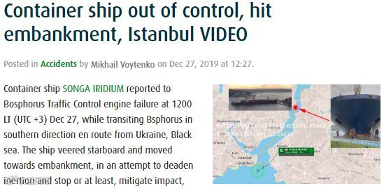 “SONGA IRIDIUM”轮正常是12月27日到达阿姆巴利港(Ambarli),28日离港驶往下一港口,通过船讯网AIS船舶定位显示,目前由于本次事故,截止今天(29日)该轮仍锚泊在马尔马拉海外锚地,船舶已延误。有中转货物配载在该轮的货代货主,请关注船公司通知及时了解船舶起航及货物延误情况。