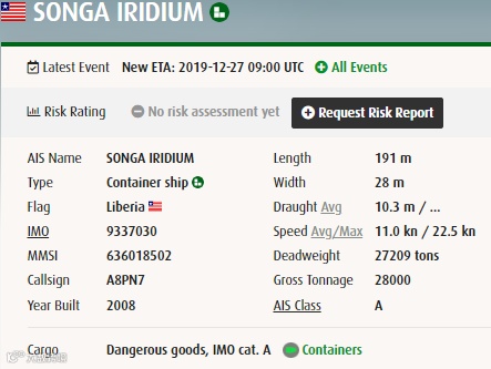 “SONGA IRIDIUM”号集装箱运力2015TEU,涉及包括达飞、赫伯罗特等5家知名船公司共舱:APL、CMA CGM、HAPAG-LLOYD、YANG MING、ZIM,是一艘服务于乌克兰敖德萨港(Odessa)、罗马尼亚康斯坦萨港(Constantza)、土耳其阿姆巴利港(Ambarli)三国港口的黑海支线船舶。