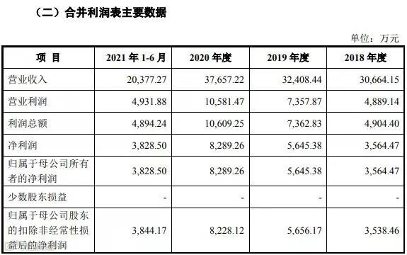 2018年-2021年1-6月,公司营业收入分别为3.07亿元、3.24亿元、3.77亿元和2.04亿元,净利润分别为3,564.47万元、5,645.38万元、8,289.26万元及3,828.50万元。