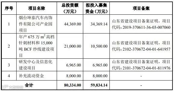 公司首次公开发行人民币普通股 A 股股票总数不超过 2,875.00 万股,公司公开发行新股数量不低于本次发行后总股本的 25%。若本次股票发行获得成功,募集资金扣除发行费用,将依次投资于以下项目:烟台坤泰汽车内饰件有限公司产业园项目、年产675 万㎡高档针刺材料和15,000 吨BCF纱线建设项目、研发中心及信息化建设项目、补充流动资金。