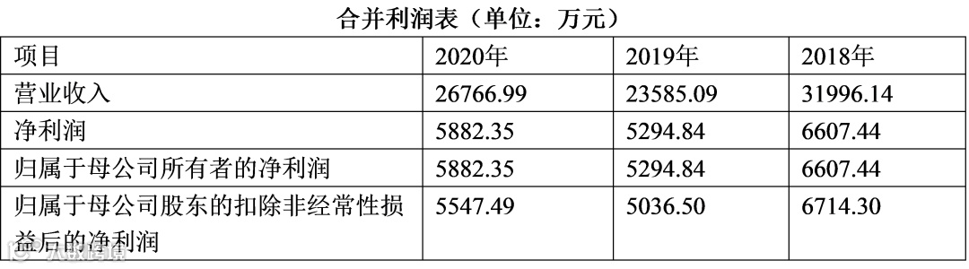 2018年-2020年,公司营业收入分别为3.20亿元、2.36亿元和2.68亿元,净利润分别为6,607.44万元、5,294.84万元和5,882.35万元。