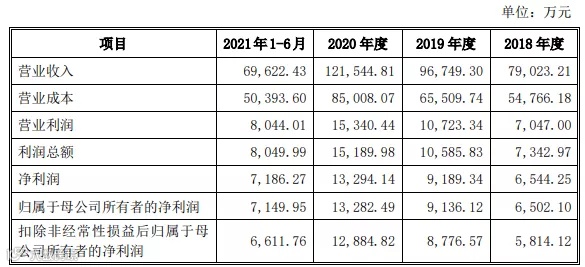 2018年至2021年1-6月,万朗磁塑实现营业收入分别为7.90亿元、9.68亿元、12.15亿元、6.96亿元,三年营收复合增速达24.0%;净利润分别为0.65亿元、0.92亿元、1.33亿元、0.72亿元,三年利润复合增速达42.5%。