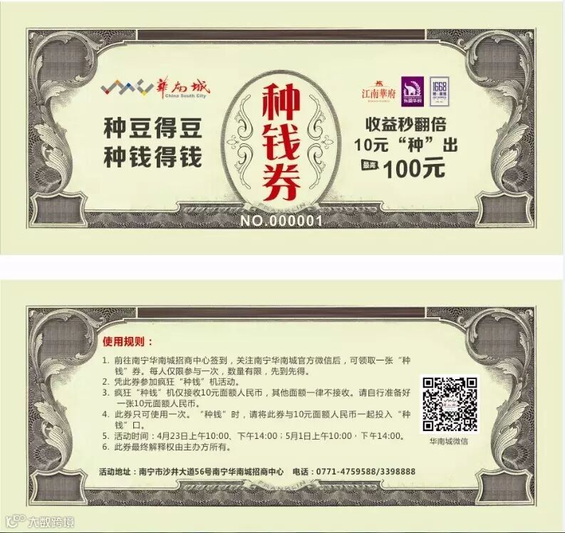 活动当天客户只需前往华南城招商中心登记,即可现场领取“种钱”劵!按照“种钱机”操作说明,投入10元,即可享受翻倍收益体验!如此神奇好事,怎能轻易错过?