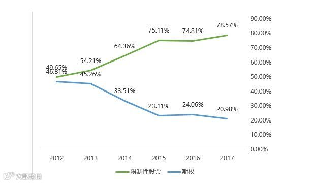 4、从2017年公告的448个方案中限制性股票方案数量达到了352例,而作为上市公司股权激励工具的另一位主力干将—期权只公告了94例占比20.98%。下面来看过去6年中公告的所有方案中限制性股票方案和期权方案的占比可以发现期权的占比不断降低,而限制性股票的占比不断提高。