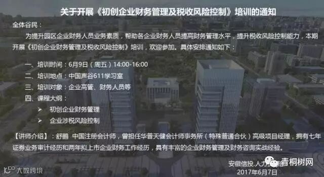 6月9日下午,合肥市高新区中国声谷举办“初创企业财务管理及税收风险控制”专场培训。上海念桐投资管理有限公司咨询总监舒鹏先生应邀出席并担任培训讲师。