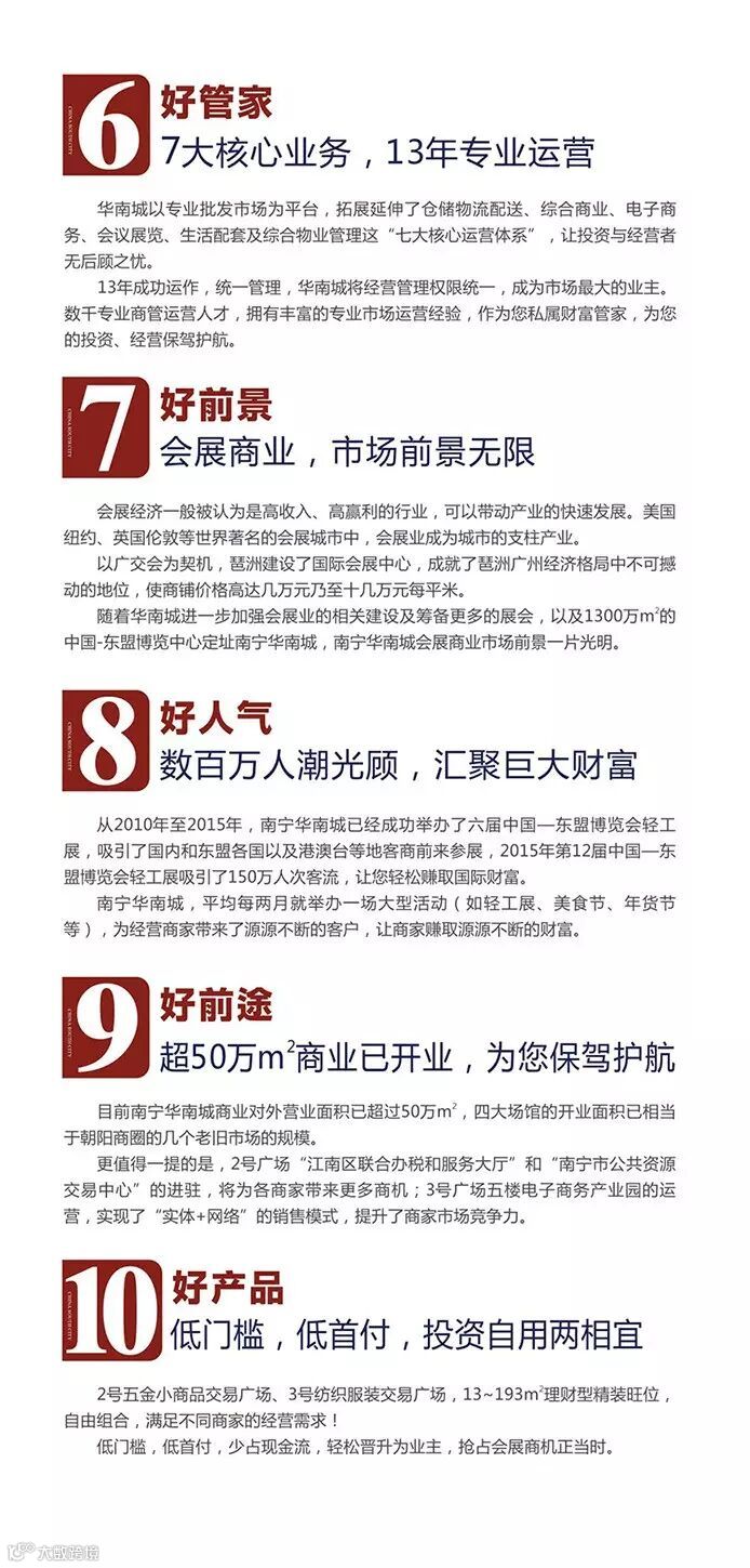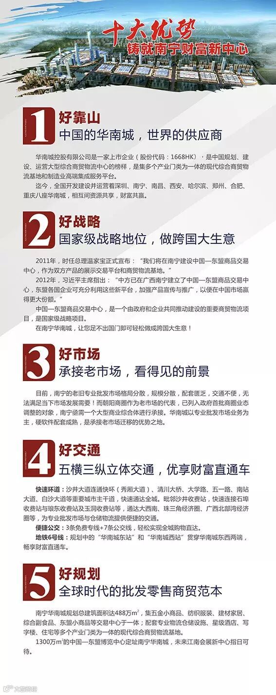 南宁华南城规划总建筑面积488万㎡,是一个集生产、生活配套服务于一体的大型产品展示交易中心、现代综合商贸物流中心和高端生产服务基地。华南城立足南宁、面向西南、服务东盟及世界,为中国、东盟搭建长期展示、交易的商贸服务平台,共同推动自贸区发展。