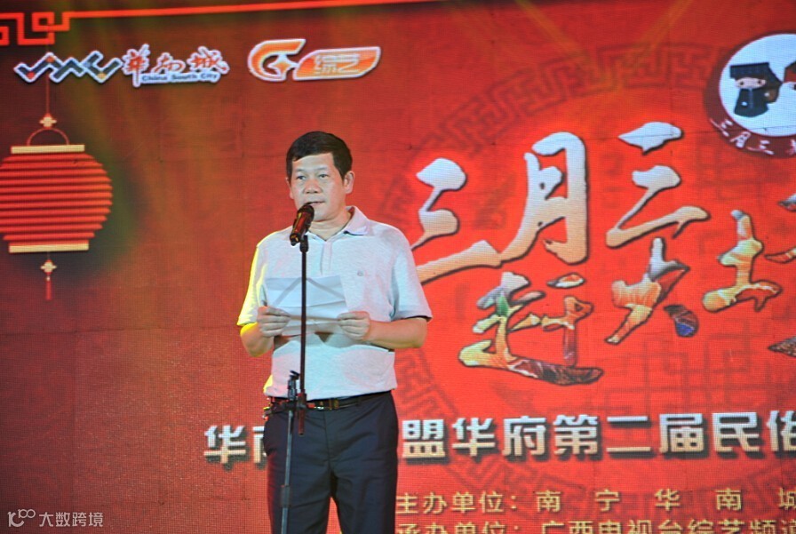 2016年4月7日晚七点三十分,由南宁华南城携手广西电视台综艺频道联袂打造的“三月三·赶大圩——华南城东盟华府第二届民俗文化商贸节”在南宁华南城隆重开幕!南宁华南城总经理王培武出席了此次开幕式晚会,并为活动发表了致辞,他既对华南城活动带动商业繁荣的模式给予了肯定,也对华南城未来的文化活动发展给予了希望。