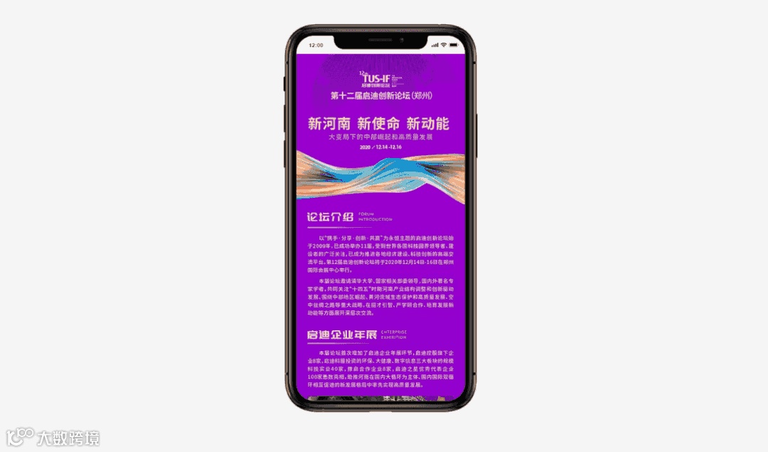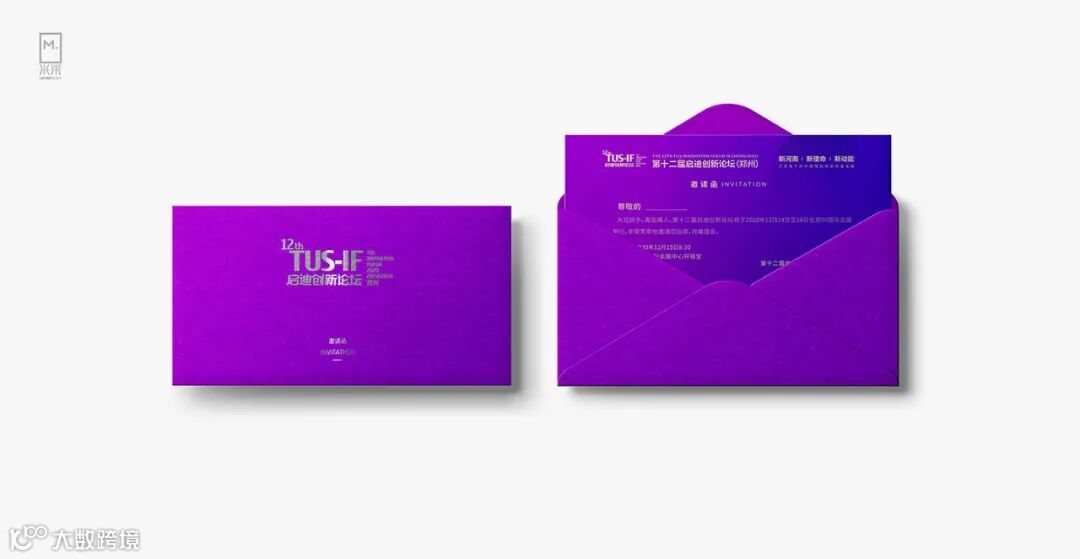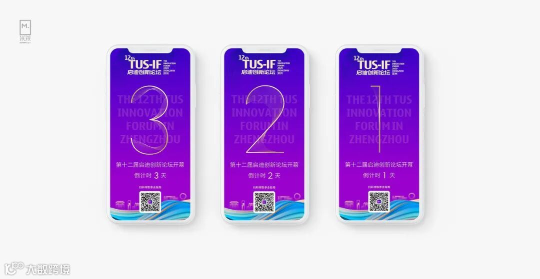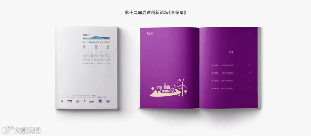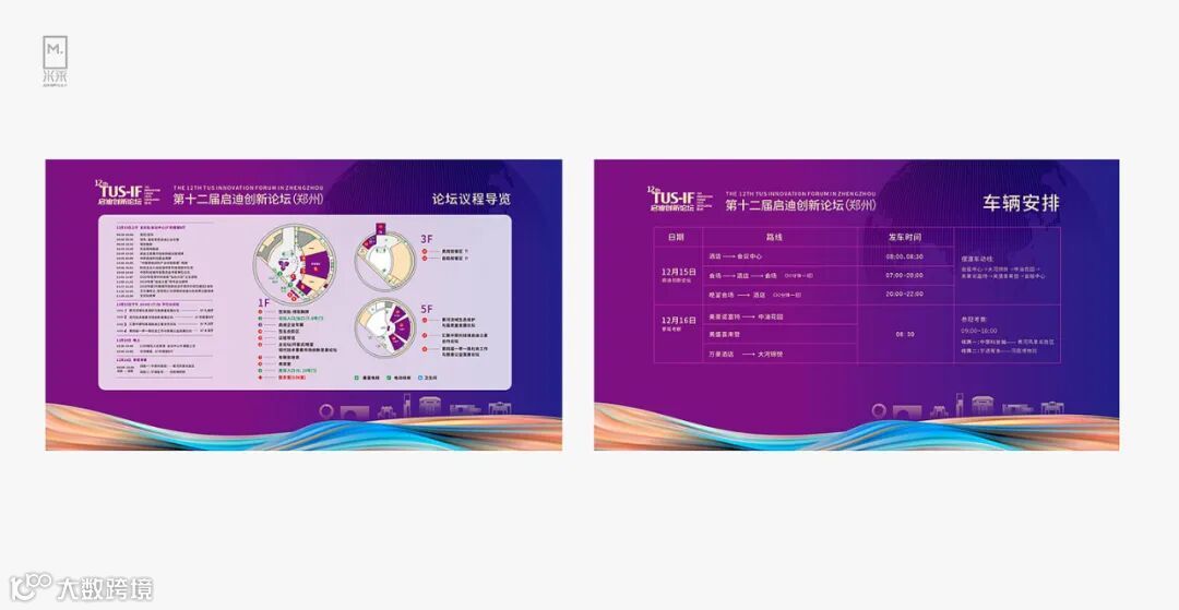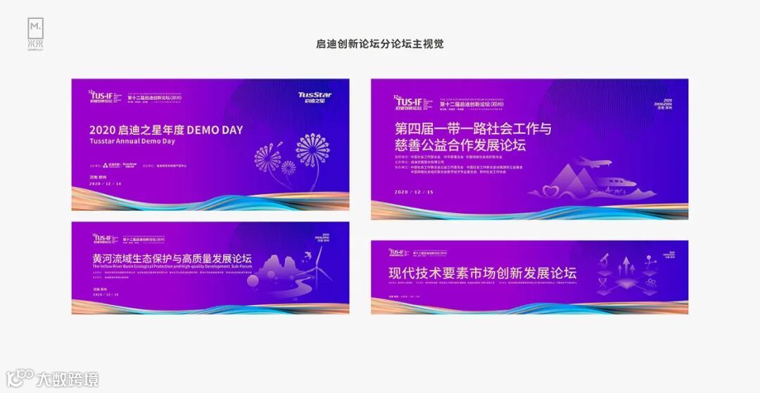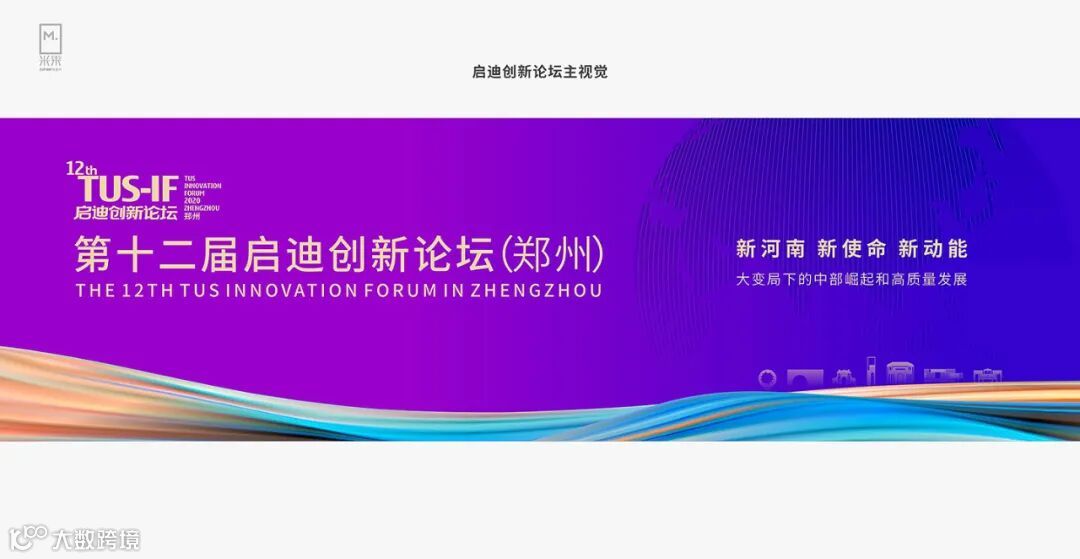 本次论坛的重点就在于如何用一个画面承载论坛的属性,奠定论坛基调,并贯穿到整体的视觉中,形成统一的品牌形象。米莱团队围绕启迪自身的品牌基因,选用品牌色蓝紫色作为论坛主配色,与品牌保持一致性,极具科技感与视觉冲击力。同时将黄河与飘扬的丝带结合作为论坛特有的视觉符号,代表科技带、黄河带,同时寓意着科技与中原、河南的融合发展。
