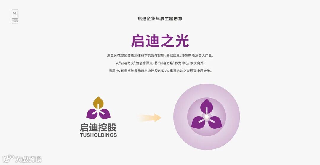 我们回归到启迪控股这个品牌,以承载启迪品牌基因的标志为突破口,用三片花瓣区分启迪控股下的医疗健康、数据信息、环保新能源三大产业,以“启迪之光”为创意源点,将“启迪之塔”作为中心,依次向外,有层次、有看点地展示出启迪控股的实力,寓意启迪之光照亮中原大地。