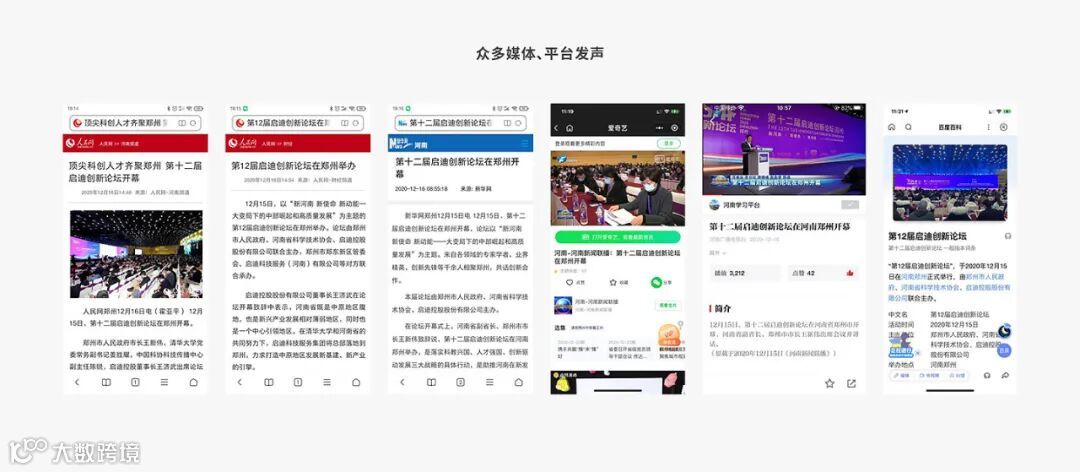 其中12月16日新华客户端发布的题为《第十二届启迪创新论坛在郑州开幕》的稿件,点击量达49.6万;论坛开幕式视频直播播放量12.7万,图文直播播放量7.2万。涵盖了报纸、电视、网站、客户端、微博、微信、抖音、头条号、视频号、百家号等平台,全方位立体式推广,全覆盖多媒体传播,使得“第十二届启迪创新论坛”成为强IP、高频词;“河南再迎重磅论坛”“1200架无人机点亮郑州夜空”两度登上微博热搜同城榜第六位和第二十七位;截至12月23日,百度搜索“第十二届启迪创新论坛”相关资讯高达228万条,搜狗搜索“第十二届启迪创新论坛”相关资讯高达208万条,“第十二届启迪创新论坛”已被列入百度百科和搜狗百科词条。