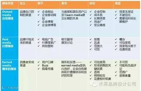 我们平时经常会听到 earned media, owned media 和 paid media 这三个词,简单理解是 earned media 就是赚来的公众口碑,owned media 是指企业自有的网站或社交媒体如微博账号,而 paid media 则比是付费购买来的电视广告或媒体广告版面,企业应该整合这三种渠道,协同发挥更大的作用。